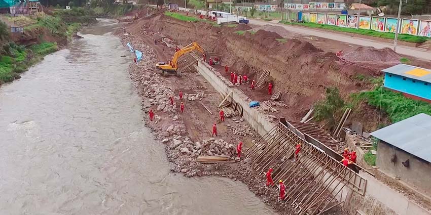 Según el residente de obra, actualmente se vienen realizando trabajos en la construcción de dos muros, uno de ellos un muro de concreto ciclópeo de 250 metros lineales en la margen izquierda del río Vilcanota y otro muro rip rap con enrocado de piedras para disipar el caudal de la fuerza del rio.