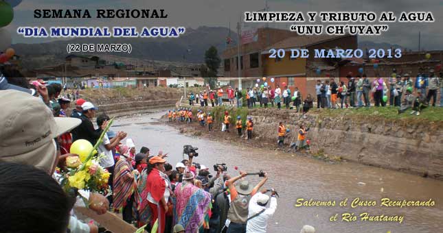 Con el propósito de participar activamente por el Día Mundial del Agua el próximo 22 de marzo, el Grupo Impulsor para la Conformación del Consejo de Cuenca del Urubamba- Vilcanota, que agrupa diversas instituciones ha elaborado un programa general con diferentes actividades. El Gobierno Regional que preside el Arq. Jorge Acurio Tito, a través del Proyecto Especial Instituto de Manejo de Agua y Medio Ambiente PER - IMA como parte de esta institucionalidad ha programado dos actividades específicas como son la limpieza del rio Huatanay y el Tributo y Reencuentro con el Agua.