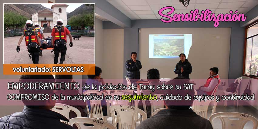 Frente a estos eventos ha reactivado el Sistema de Alerta Temprana en el distrito de Taray, involucrando a la población a través de la conformación del equipo de líderes voluntarios denominado: Los SERVOLTA (Servicio de Voluntariado de Taray) quienes ya están capacitados y sensibilizados respecto a las medidas de seguridad y rescate; destacando que la oficina del SAT se encuentra debidamente implementada.