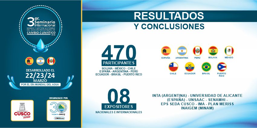 Con participantes de más de 10 países de Europa y América, con rotundo éxito se desarrolló el Seminario Internacional 2021 “Manejo Y Gestión Sostenible del Agua en un Escenario de Cambio Climático”, en su tercera edición, donde participaron expositores de España, Argentina y nuestro país, quienes dieron a conocer diversas experiencias en el manejo óptimo del agua. Dicho evento fue organizado por el Gobierno Regional del Cusco a través del Instituto de Manejo de Agua y Medio Ambiente - IMA, en el marco del Día Mundial del Agua, que se recordó el lunes 22 de marzo.