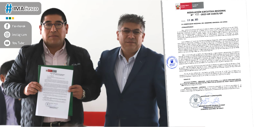 Mediante Resolución Ejecutiva Regional Nº 005-2023-GR CUSCO/GR, de fecha 03 de enero del año en curso, fue designado como nuevo Director Ejecutivo del Instituto de Manejo de Agua y Medio Ambiente-IMA el Ing. Carlos Jesús Baca García, quien fue presentado por el Gobernador Regional Ing. Werner Salcedo Alvares, ante los trabajadores de la institución ambiental.